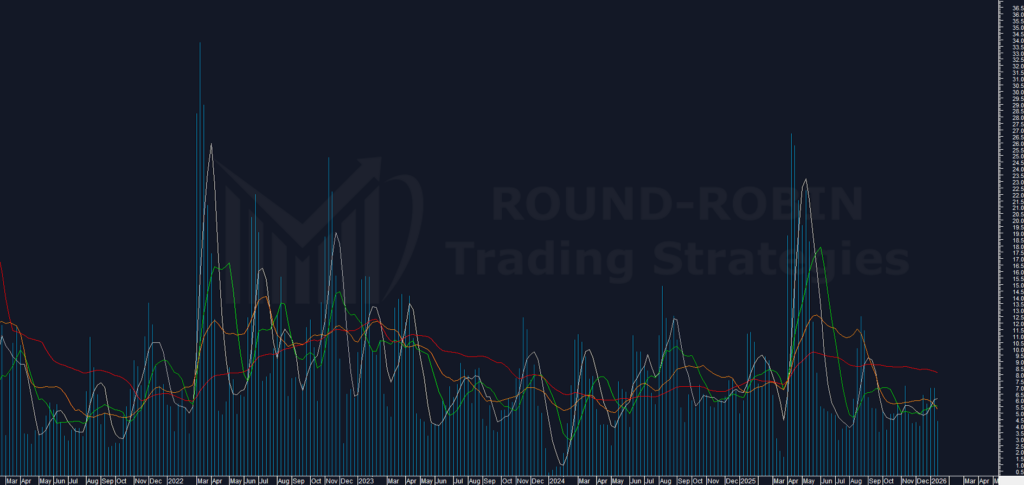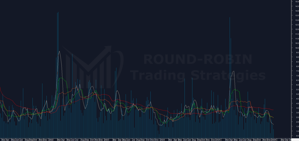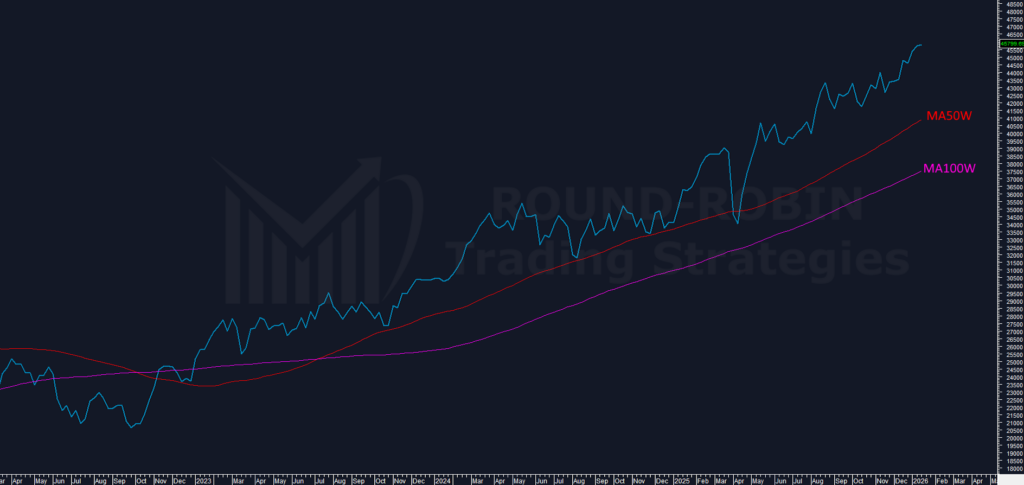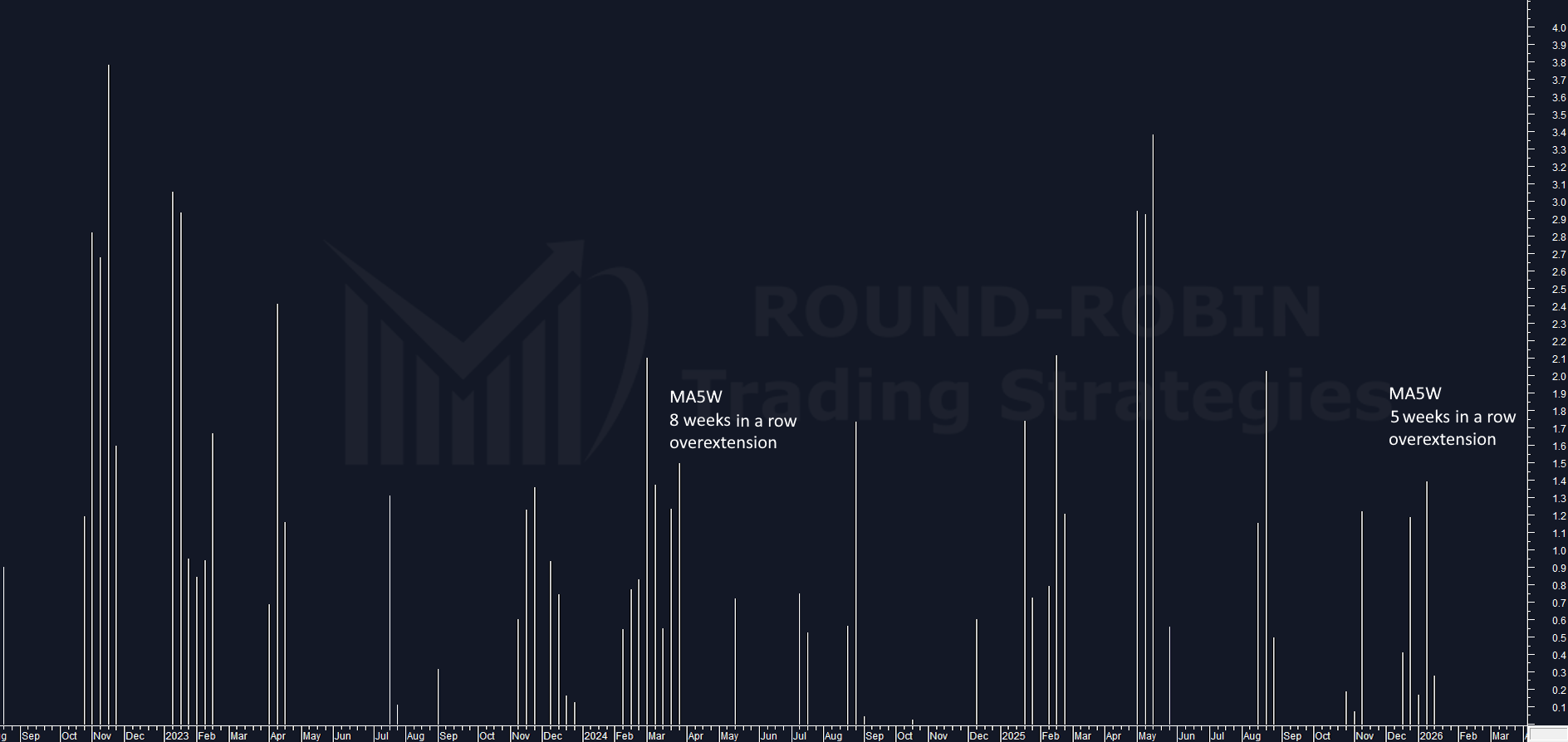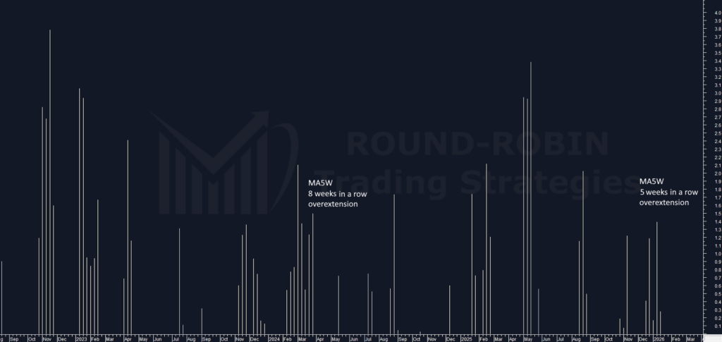 This is the fifth consecutive week with prices completely detached from the MA5W. Not by much — +1.40% last week, only +0.28% this week. But it’s still five weeks. The last time a streak lasted longer was March 2024, when it ended after eight weeks.