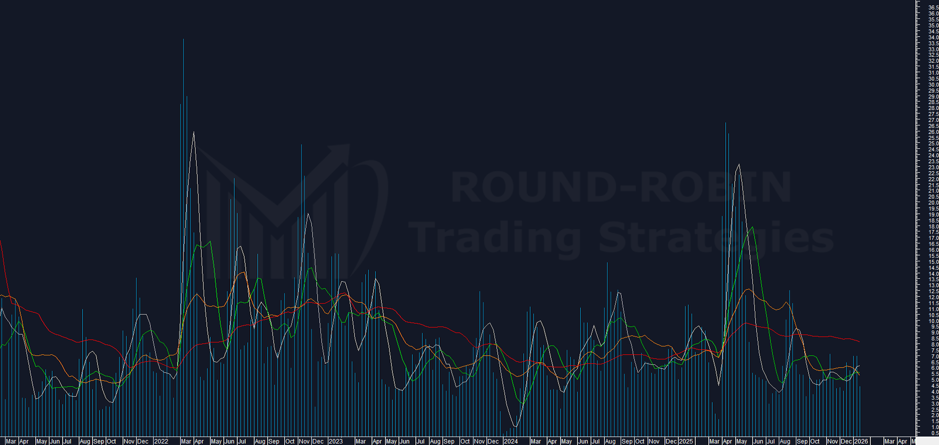 There’s something. Volatility is declining, as my proprietary indicator shows: price oscillation for the week stands at 4.41%, an interesting level.