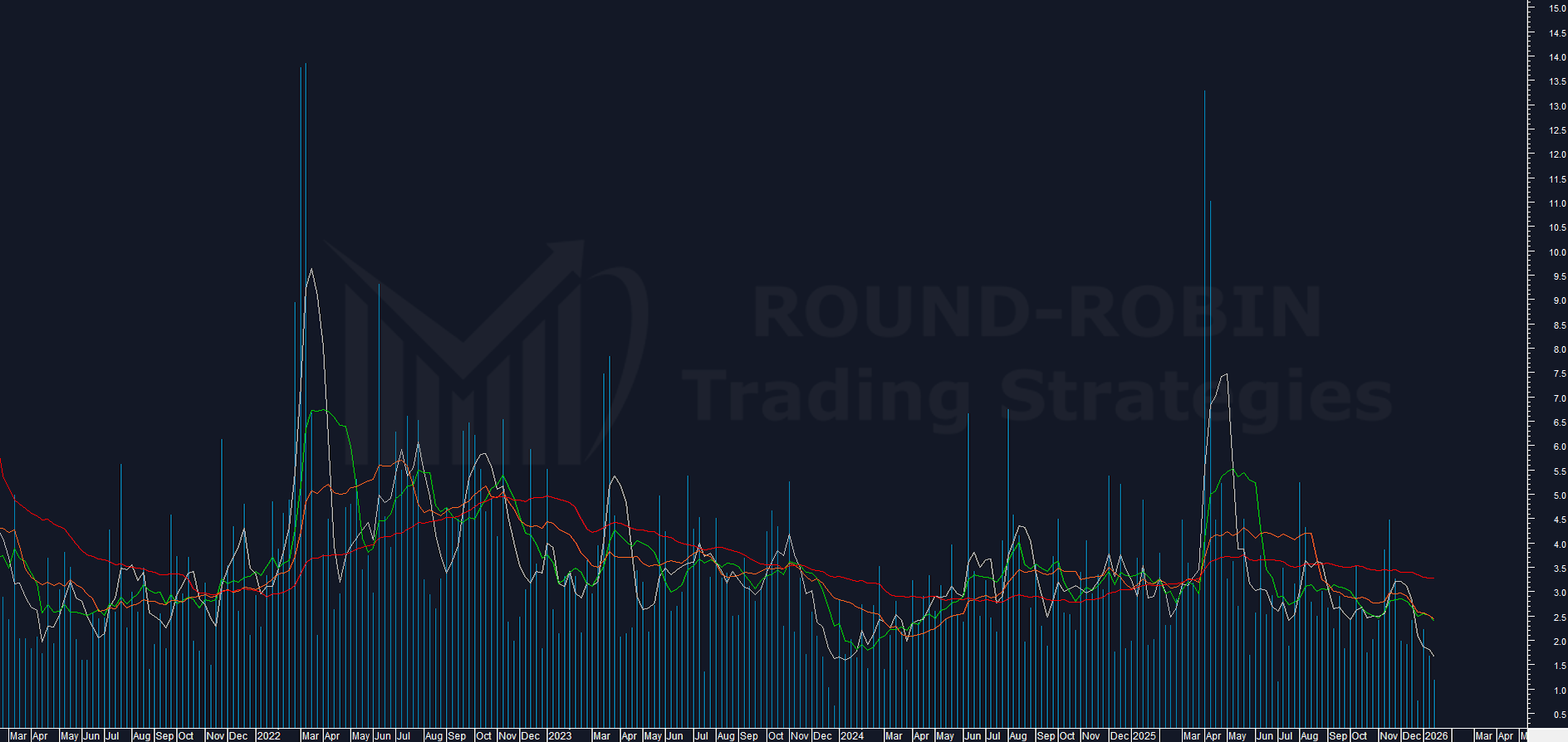 The weekly range keeps shrinking: this week it came in at 1.21%, the lowest since the week of July 4, 2025 (excluding the short Christmas week). To find values this low, you have to go back to December 2023, when the accumulation phase that kicked off the multi-year rally came to an end.