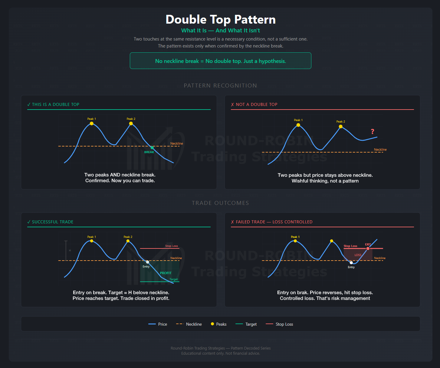 A double top doesn’t exist when price hits resistance twice. It exists when price confirms it can’t break through — and the only confirmation that matters is the break of the neckline.